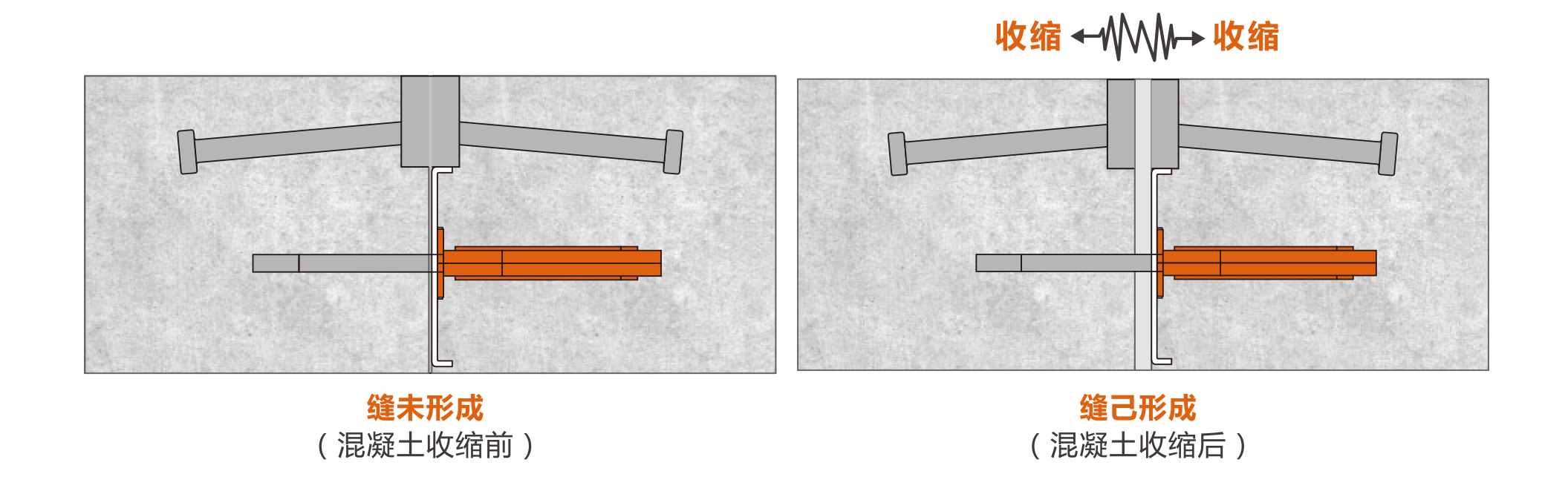 B型鎧裝縫由兩根10*40mm冷拉扁鋼,錨固栓釘,傳力桿/板,傳力桿/板伸縮套,擋料板,易斷塑料螺栓等組成。